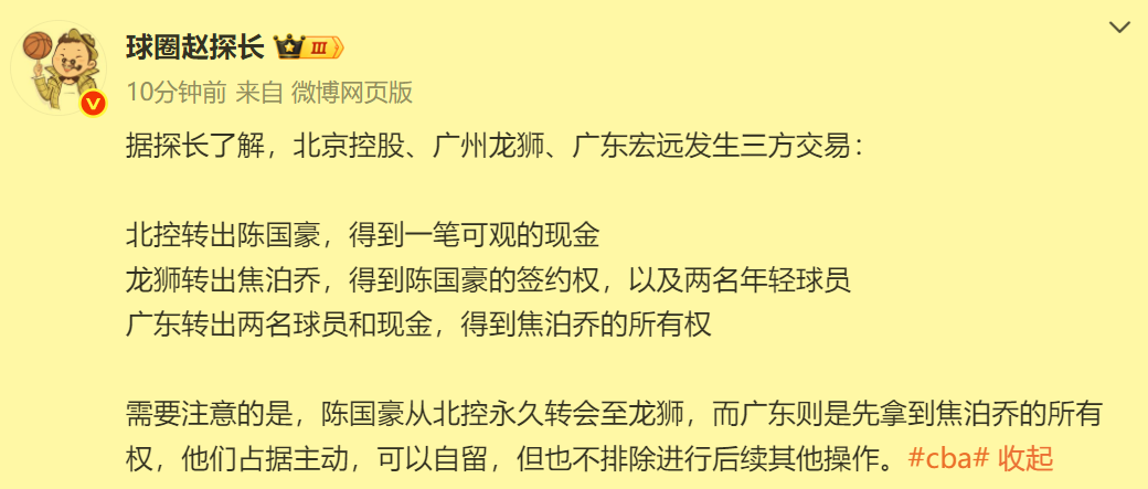 又一笔三方交易曝光!广东宏远狂砸千万引进陈国豪,铁定和郭艾伦做队友!CBA本土球员的注册截止日期是31日24点,满打满算也就仅剩一周时间,有交易想法的球队,会抓紧时间进行谈判,争取在注册截止日前完成交易,得到自己心仪的球员,否则只能等到下赛季的窗口期了。据悉,继去年休赛期辽篮的郭艾伦、南京同曦队的王岚嵚和广州队的祝铭震完成三方交易之后,又一笔三方交易正式曝光...
